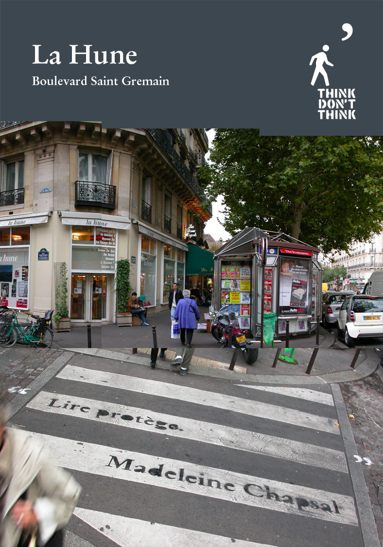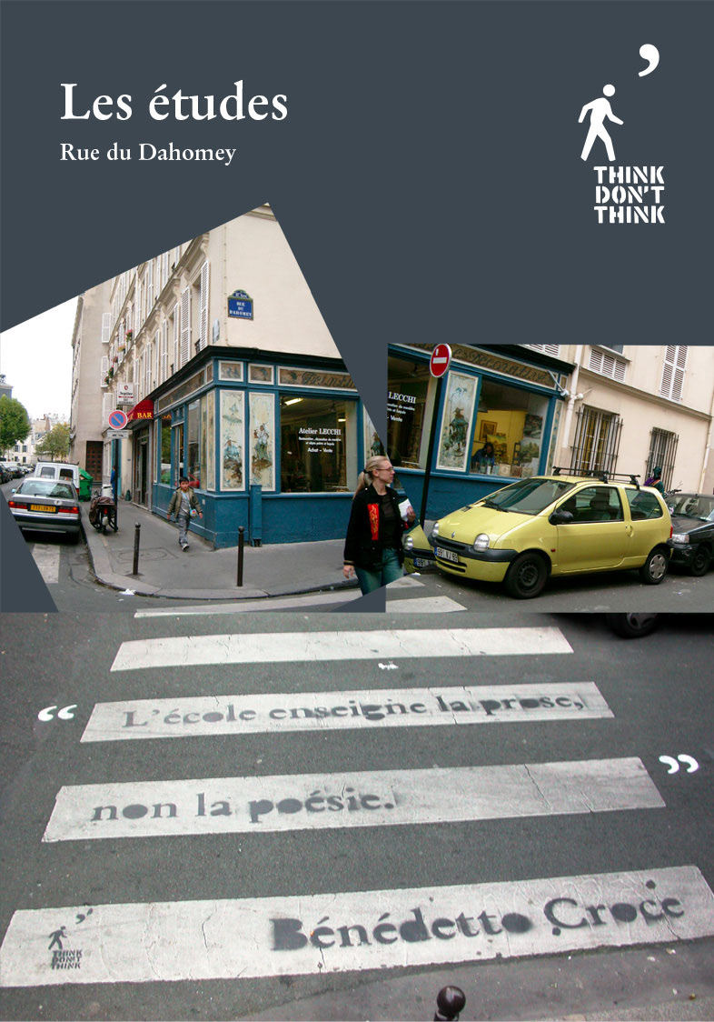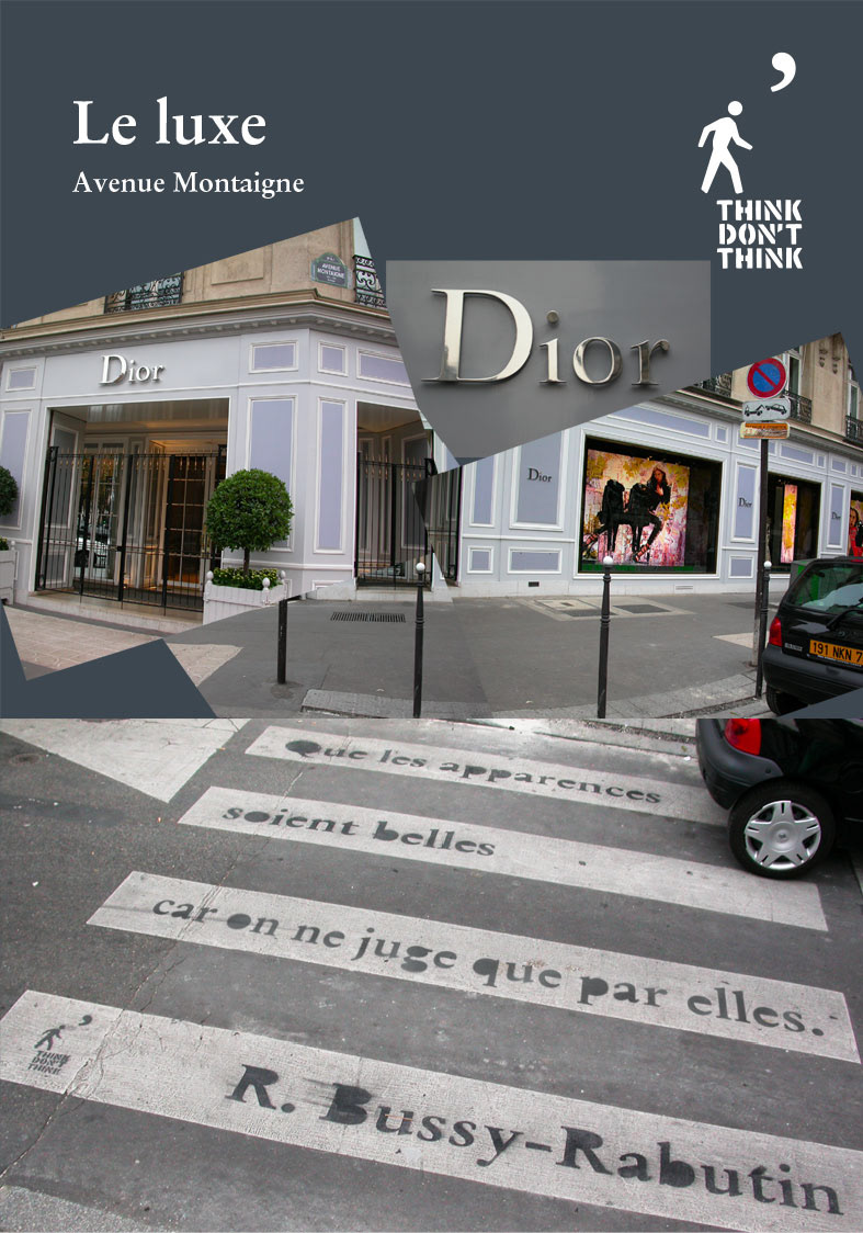 Projet de street art réalisé à Paris en 2003 utilisant les passages piétons comme support de communication. Il se compose seulement de 8 passages piétons ; le dernier étant celui devant chez Dior, Avenue Montaigne, qui nous a valu, avec Jean Paul Bagnis mon associé de l'époque, quelques heures au poste de police et surtout la confiscation de nos centaines de lettres Stempel Garamond. Merci la Police! (Scroll down you will find a link with an article in English of the Eye magazine)