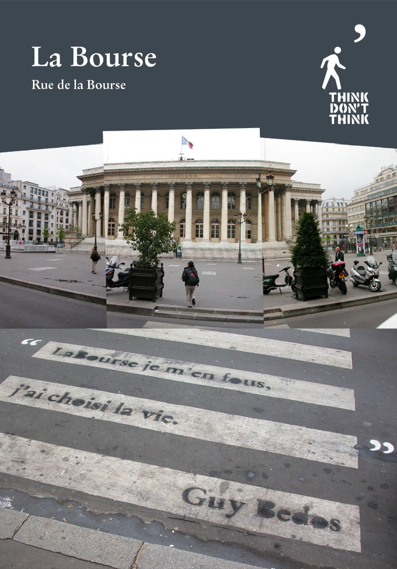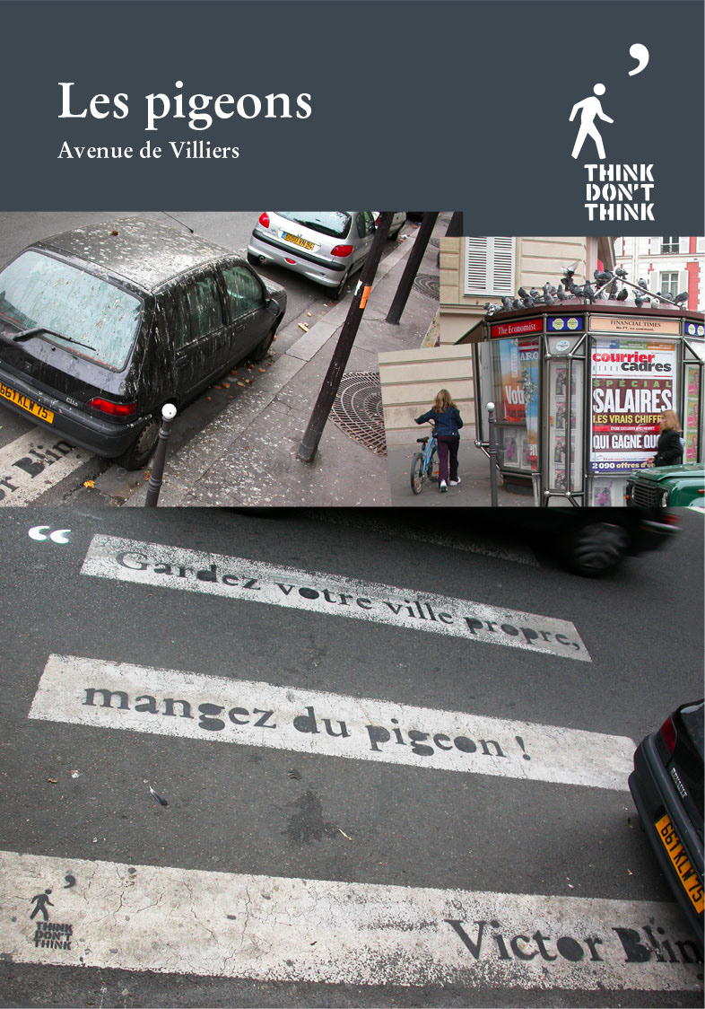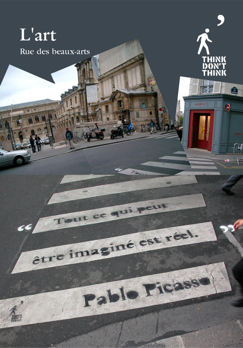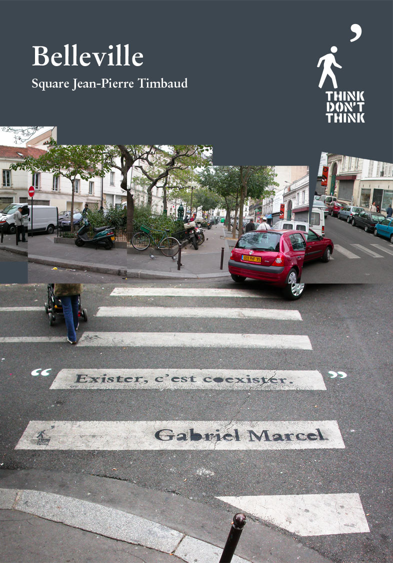 Projet de street art réalisé à Paris en 2003 utilisant les passages piétons comme support de communication. Il se compose seulement de 8 passages piétons ; le dernier étant celui devant chez Dior, Avenue Montaigne, qui nous a valu, avec Jean Paul Bagnis mon associé de l'époque, quelques heures au poste de police et surtout la confiscation de nos centaines de lettres Stempel Garamond. Merci la Police! (Scroll down you will find a link with an article in English of the Eye magazine)
